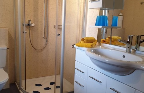 Spacious flat: eat-in kitchen with dishwasher, electric and wood-burning cooker and wood fire, living room with tiled stove, 1 bedroom on the ground floor, 3 bedrooms on the upper floor, shower/WC on the upper floor.