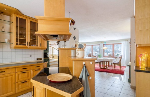 The property is situated in a prime residential area, centrally located yet quiet. The city center and sights can be reached within a few minutes on foot. The exclusive 4-room holiday apartment is in an end-terrace house over two floors (ground floor and upper floor) and offers 130 sqm of living space with a beautiful panoramic view over Triberg. The apartment accommodates up to 6 people; there are three bedrooms of different sizes, and a baby cot can be provided. The spacious open-plan layout includes a living room, dining room, and kitchen. A soapstone stove in the Black Forest clock room creates a cozy atmosphere. For relaxation, a massage chair is available. The kitchen is fully equipped with dishes and all necessary utensils for cooking and dining: cooking island, induction hob, oven with grill plate, dishwasher, kettle, toaster, filter and pod coffee machine, hand mixer, and bread slicer. The furnishings are of high quality, with solid wood furniture as well as parquet and tiled floors. There is a gas heating system, underfloor heating on the ground floor, and a fireplace, as well as Wi-Fi and cable TV. A covered carport or two parking spaces are available directly at the house. Bicycles, bikes, or skis can be stored in the garage upon prior arrangement. The attached conservatory on the upper floor is currently not part of the rental property and will be integrated into the holiday apartment after renovation.