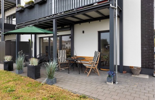 Additionally, this apartment offers a private outdoor space with a cozily furnished covered terrace and a barbecue.