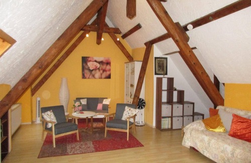 The apartment renovated in 2015 is on the second floor of the house. The 70m² apartment can accommodate up to three people and is spread over two floors (maisonette apartment). It has a bedroom with a double bed (160cm wide), a fully-equipped kitchen unit with a microwave, coffee machine, fridge with freezer compartment, kettle, egg boiler, toaster etc. (no dishwasher). There is also a bathroom with a shower, WC and washbasin. The living room provides a two-seater sofa and two armchairs with a table, a display cupboard, built-in cupboards, a sofa bed, a Bullerjan stove, satellite TV and a CD-radio player. All laundry is provided (towels, table linen and bed linen).