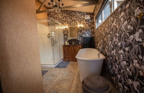 The bathroom has a French theme. Along one side sits a deep cast-iron bath, and along the other side is a large shower with a rain shower head that soaks you in hot water. The bathroom even has a chandelier to look up to.