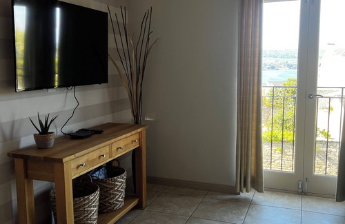 On the second floor is an open plan lounge and kitchen with dining area that seats 5 people. There's a flat screen TV with Freeview and media apps in the lounge area as well as a cosy gas fire. Double doors open out onto the balconette with stunning views across Swanage Bay. Appliances in the kitchen include a microwave, dishwasher and electric cooker with gas hob. The property has wifi throughout.