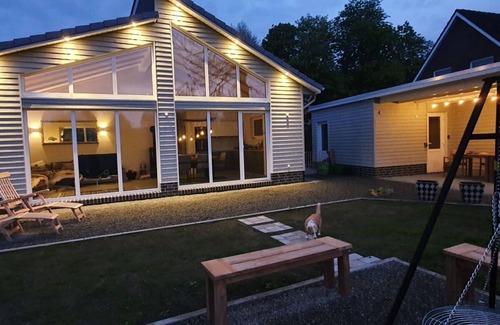NEW, first occupancy May 2021! Our new, detached “eco” house is located in idyllic surroundings. Sustainable building materials, the avoidance of fossil fuels, green electricity, a reflective, heat-repellent roof, the use of rainwater for garden irrigation, etc. are just as much a part of the concept as good country air and lots of holiday joy. The house offers enough space for 6 people and has three bedrooms. The high-quality furnishings are stylish and comfortable at the same time. Large garden, two terraces (one covered), garden sauna, fireplace, storage space for your bicycles. A relaxed holiday with family and friends is guaranteed.
