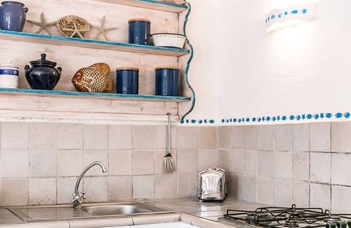 The holiday home Casa Contrada del Sole is located in the heart of the village Baja Sardinia, only a few minutes’ walk from the beautiful, sandy beach of the town. 4 stairs lead to the entrance of the cottage, which consists of a living room decorated in maritime style with a sofa bed, a well-equipped kitchen, one bedroom as well as one bathroom and can therefore accommodate 4 people. It also has air conditioning and television. Outside there is a covered terrace overlooking the sea and the mountains in the distance. Start your day here with a hot cup of coffee, enjoy delicious meals in the fresh air or take a nap on the bench decorated with pretty cushions. A selection of restaurants and the sandy beach are 7 minutes away on foot (500 m) and a supermarket is just outside the village, 600 m away. The popular Phi Beach sunset viewpoint is 1.4 km or an 18-minute walk away, where you can enjoy a fantastic view of the sunset while having a delicious cocktail. A golf course is located within 20 km of the property. It is the perfect place to spend romantic hours with your loved ones and forget the stress of everyday life!