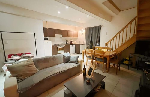 Enjoy a traditional atmosphere with all modern comforts! On the ground floor, you’ll find a spacious living area with a fully equipped kitchen and bar, dishwasher, dining table for 8–10 guests or more, a lounge area with a wood-burning stove and sofa bed, a bathroom with walk-in shower and toilet, and a laundry area with washing machine. The private terrace, with outdoor furniture and barbecue, offers breathtaking views of the foothills and Pyrenean peaks, including Pic du Midi and Montaigu, with access to a shared garden.