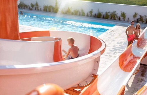 Layout: Ground floor: (open kitchen(hob(2 ring stoves, induction), electric kettle, toaster, microwave, fridge-freezer), Living/diningroom(double sofa bed, TV(flatscreen), dining table), bathroom(shower, washbasin, toilet, hairdryer)) On the 1st floor: (bedroom(single bed, double bed), bedroom(single bed, double bed)) Reception, Internet access, Parking, Waterslide, Whirlpool, Table tennis, Sporting field(s), Football field, Volleyball field, Basketball, Bar, Indoor playroom, Play area, Lawn, baby bath, washing machine(paid), balcony, heating(electric), terrace(private, roofed), garden(shared with other guests, fenced, 1,5 hm2), garden furniture, sun loungers, BBQ(shared with other guests, charcoal), trampoline(shared with other guests), swimming pool(shared with other guests, outside, heatable, including separate children’s swimming pool (depth 50cm), cover, 14 x 6 m opened from Jun upto and including 1/2 Sep), sand pit(shared with other guests), slide(shared with other guests), high chair, ironing board, iron, party games, Swing set, baby crib(free)