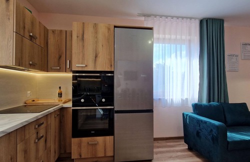 Comfortable, new holiday home with a swimming pool, situated in a picturesque place surrounded by mountains and forests, away from civilization and city noise. The house is located in Wiśniowa - a village 30 km from the city of Rzeszów and 35 km from the Rzeszów-Jasionka airport. The facility has an area of 190 m2 and is suitable for 12 people. Around it there is a recreation area with a barbecue gazebo and a swimming pool. Right next to it there are two small ponds where you can go fishing a bit. There are many suggestions for interesting hiking tours. There are six 2-person rooms, each with two single beds with the option of joining into a double. Additionally, each has a separate bathroom with a shower. The rooms are equipped with a wardrobe, a desk with chairs and a TV set with a satellite antenna. The property has two floors. On the first floor there are four bedrooms and an open relaxation "reading corner", i.e. a place with a sofa, table, lamp and bookcase with reading items. On the ground floor there is a spacious vestibule, two bedrooms, a small separate toilet, a small room economic and a living room with a kitchen. One of the rooms with a bathroom is fully adapted for the disabled. The bathroom has all the necessary handles for the disabled. The ground floor is also adapted for a disabled person in a wheelchair - it is easy to get to the house, room, living room and kitchen. The two downstairs rooms have separate patio doors that lead directly to the outside. The kitchen with an open living room is a common place for all guests. The living room has two chests of drawers, a large table for 12 people and a TV set. The fully equipped kitchen includes all necessary household appliances, i.e. an induction cooker, a microwave oven, an oven, a fridge with a freezer, a dishwasher, a washing machine, a toaster, an overflow coffee machine and a kettle. Additionally, the kitchen has two sofas, an armchair and a table with a few board games. In the salon mi
