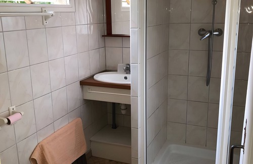 -Bathroom with shower, basin, and WC