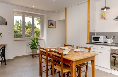The holiday home Gite Les Deux Tilleuls with step-free access is located in Porte-des-Bonnevaux and is the ideal accommodation for a relaxing getaway. The 120 m² property consists of a living room, a kitchen, 3 bedrooms and 1 bathroom as well as an additional toilet and can therefore accommodate 7 people. Additional amenities include Wi-Fi, a TV, a washing machine as well as children's books and toys. A baby cot and a high chair are also available. This accommodation does not offer: air conditioning. Enjoy the convenience of a private barbecue for cooking delicious meals during your stay.