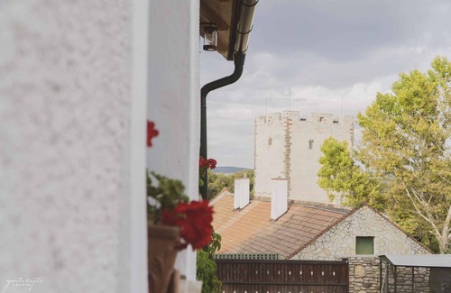 The detached holiday home built in 1936, was renovated in 2022 and is furnished in a typical country style. The property is located in the town centre, near the old town. Also due to the view over a panorama from the property and its quiet and sunny location the domicile is popular. Available for your exclusive use: sun lounger, terrace, pavilion, garden furniture and courtyard.LocationNagyvázsony, 300 m above sea level. The holiday home is located on a 400 sqm enclosed garden plot with meadow and flowers, bordered by a fence. The landlord does not live in the house or on the property. Our almost 100 year old, recently renovated farmhouse with an enchanting panorama opposite the Kinizzi Castle has 2 four-person apartments. The apartments have a private bathroom. The apartments have a common, well-equipped communal kitchen that meets all needs. The 60 square meter covered and equally large open terrace is for the comfort of the guests. On the covered terrace, guests have a 5-person whirlpool with radio and deck chairs with a view of Kinizsi Castle. The village atmosphere is enhanced by the enclosed chicken yard in the garden, which is home to Japanese chickens and a family of roosters. The guest staying here will be woken up in the morning by the sound of a real rooster. Our farmhouse is a separate house, with a separate courtyard and separate parking lot. The farmhouse is protected by a camera system, although public safety is excellent in our area. The settlement is 12 km away from Lake Balaton, besides Lake Balaton there are many excursion possibilities in the area. The Blue Tour route also passes through the settlement. Our guest house is located next to Kinizsi Castle and has a beautiful view of Kinizsi Castle. In a quiet, quiet street, with private parking. Access is via a side road (asphalted). Parking (for 2 cars) is available on the property. Specialunderfloor heating.Facilities: internet access (WLAN). TV reception takes place via electric wire.For your safety, the accommodation is equipped with smoke detector. WellnessSauna and whirlpool. Dogsnot allowed. DistancesShopping 200 m, restaurant 50 m, town center 150 m. pharmacy, bank each 150 m in Nagyvázsony. In summer: Balaton 10 km in Zánka (beach 10 km in Zánka featuring gravel). DivisionHoliday home, 1 floor, 2 rooms (including 2 bedrooms), 100 sqm, in total 8 beds (including 4 additional beds). RoomThe entrance to your holiday home is located on the ground floor and leads over an external staircase directly into the kitchen-diner with sitting area. Bedroom (25 sqm) with 1 double bed and 2 additional beds on double sofa bed. Bedroom (28 sqm) with 1 double bed, 2 additional beds on double sofa bed and access to the terrace. American kitchen (20 sqm) with TV, dining area (8 seats), electric stove (induction stove, 4 plates), extractor hood, dishwasher, fridge (110 l, icebox), microwave, coffee machine, toaster, electric kettle and access to the terrace. Bathroom (4 sqm) with shower, 1 washbasin and WC. Bathroom (3 sqm) with shower, 1 washbasin and WC. Terms of lease and pricesIncluded in the pricesauna, internet access, parking place, sauna, whirlpool, electricity, gas, water, final cleaning, bed linen, hand towels, sunloungers, Wireless Internet access. Side costs-Additionally(Payable when booking)/local tax.Deposit:EUR 150,-/object