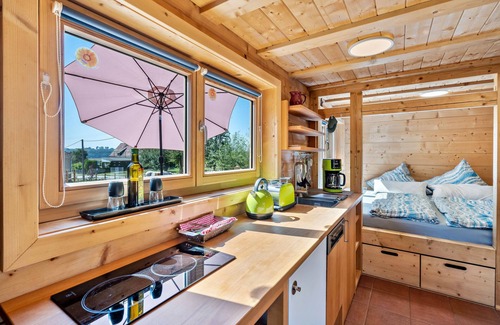The Tinyhaus im Eselgarten is located in the Lommatzscher Pflege region near Meissen and is perfect for a time-out. The 17 m² cottage consists of a living-dining area with a well-equipped kitchen, a bathroom and a cozy sleeping area with a large family bed for 2-4 people.
