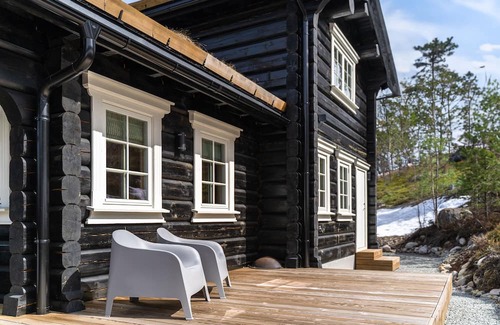 This atmospherically decorated house with a large sun terrace is peacefully situated on a mountain overlooking Lake Vråvatn.