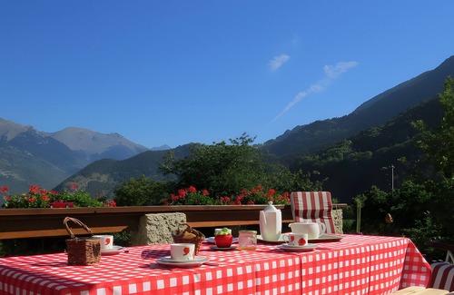 Renovated 18th-century country house in the heart of a small hamlet nestled between meadows and forests on a plateau overlooking the valley. Very quiet location. Exotic mountain charm. Very comfortable. Small balcony + beautiful terrace (35 m²) with flowers and panoramic view of the mountains and valley.
