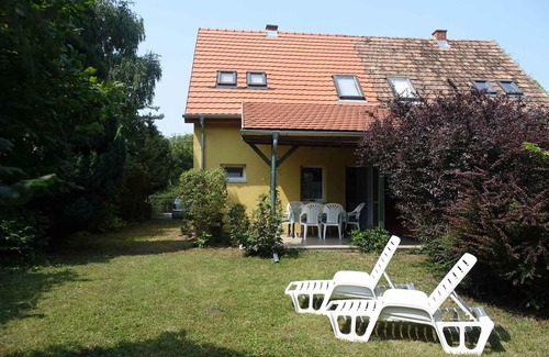 Holiday home with air conditioning and wIFI The holiday home, built in 1989 and renovated in 2021 is a semi-detached house and functional furnished. The property is located in a holiday home area, on the outskirts. The domicile is also popular because of the quiet and sunny location. For sole use are available: sun lounger, grill possibility, terrace, garden furniture, fire place and court.LageSiófok-Sóstó. The holiday home is located on a 200 sqm, closed plot with bushes and trees, limited by a hedce. The landlord does not live in the house or on the property. The access goes via a side road (asphalted). Parking lot (for 2 cars) on the property and the street in front of the house. Speziellesair conditioner. Facilities: internet access (WLAN). TV reception takes place via satellite. chaines étrangères Hundenot allowed. EntfernungenShopping opportunity 800 m, restaurant 800 m, town center 4 km.In summer: Balaton 800 m in Sóstó (beach 800 m in Sóstó with meadow). water sports in Sóstó 800 m. AufteilungHoliday home, 2 floors, 4 rooms (including 3 bed rooms), 68 sqm, in total 6 beds. ZimmerThe entrance in your holiday home is located on the ground floor, is at ground level and leads over the 10 sqm terrace directly in the aat-in kitchen.Ground floor: Living room with sitting area, TV, dining area (6 seats) and access to the terrace (18 sqm, covered, garden furniture, 1 table, 6 chairs). Cooking nook in the living room with gas stove (4 flames), oven, microwave and coffee machine. Bathroom with shower, 1 sink, WC and window. 1st floor: 2 bedrooms each with 2 single beds. Bedroom with 2 single beds. Bathroom with bathtub, 1 sink, WC, hairdryer and window. Mietbedingungen und PreiseIm Preis bereits enthalteninternet access, air conditioning, parking place, electricity, gas, water, final cleaning, bed linen, hand towels, Wireless Internet access. Nebenkosten-Kosten vor Ort:/Obligatorisch:local tax by local tariff.Kaution:EUR 100,-/object