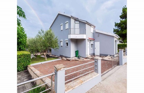 The detached holiday home is furnished in a modern style. The property is located on the outskirts. Also due to the view over the sea from the property and its quiet and sunny location the domicile is popular. Available for your exclusive use: parasol, sun lounger, children's playground, swing, barbecue facilities, terrace and garden furniture.LocationPridraga. The holiday home is located on a enclosed garden plot with meadow, flowers, shrubs and trees. The landlord does not live in the house or on the property. Access is via a side road (asphalted). Parking is available on the property. Specialair conditioning.Facilities: baby cot, internet access (WLAN), iron and washing machine. TV reception takes place via satellite. Dogsnot allowed. DistancesShopping 800 m, restaurant 50 m, town center 800 m. Children's playground 700 m, Zadar 35 km away. In summer: Adriatic Sea 200 m in Pridraga (beach 200 m in Pridraga featuring gravel and bathing plateaus). horse riding in Benkovac 20 km. DivisionHoliday home, 2 floors, 5 rooms (including 4 bedrooms), 220 sqm, in total 10 beds (including 2 additional beds). RoomThe entrance to your holiday home is located on the ground floor, is at ground level and leads directly into the hallway.Ground floor: Bedroom with 1 double bed, 1 baby cot and access to the balcony. Living/bedroom with sitting area, TV and access to the terrace (12 sqm, covered, garden furniture). Cooking nook in the living & bedroom with dining area, electric stove (4 plates), oven, extractor hood, dishwasher, fridge (icebox), microwave, coffee machine, toaster and electric kettle. Bathroom with shower, 1 washbasin and WC. Separate toilet with washing machine, 1 washbasin, WC, hairdryer and window. 1st floor: 2 bedrooms each with 2 single beds and access to the balcony. Bedroom with 1 double bed and access to the balcony. 2 bathrooms each with shower, 1 washbasin, WC, hairdryer and window. Bathroom with shower, 1 washbasin, WC, bidet, hairdryer and window. Terms of lease and pricesIncluded in the pricebabycot, internet access, air conditioning, parking place, washing machine, electricity, gas, water, final cleaning, bed linen, hand towels, baby cot – please order at booking, Wireless Internet access. Side costs-Additionally(Payable when booking)/local tax.Deposit:EUR 200,-/object.