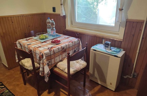 The detached holiday home is furnished in a rustic style. The property is located in a residential area, in the town centre. Also due to its quiet and sunny location the domicile is popular. Available for your exclusive use: sunbathing lawn, parasol, sun lounger, children's playground, swing, sandpit, barbecue facilities, terrace, garden furniture, Hollywood swing, campfire site and courtyard.LocationAgárd. The holiday home is located on a 900 sqm enclosed garden plot with meadow, flowers, shrubs and trees, bordered by a fence. The landlord lives permanently in a separate building on the property. Access is via a side road (asphalted). Parking (for 2 cars) is available on the property. Specialair conditioning.Facilities: baby cot, internet access (WLAN), safe and washing machine. TV reception takes place via satellite.For your safety, the accommodation is equipped with smoke detector. Dogsnot allowed. DistancesShopping 600 m, restaurant 550 m, town center 600 m. Agárd: railway station 1000 m, thermal bath, indoor swimming pool, sauna each 1200 m. pharmacy, bank each 1,7 km. doctor 220 m. airport in Budapest 65 km. cinema in Székesfehérvár 21 km. Railway line 800 m. Main road 650 m. Children's playground 650 m. In summer: Bathing possibility 800 m in Agárd (beach 800 m in Agárd featuring meadow and sand). Agárd: tennis 1000 m and fishing, boat rental, boat launch each 800 m. horse riding in Dinnyés 2 km. dog beach in Velence 8 km. DivisionHoliday home, 2 floors, 6 rooms (including 3 bedrooms), 160 sqm, in total 6 beds, on request additionally 1 child up to 2 years in a baby cot. RoomThe entrance to your holiday home is located on the ground floor, is covered and leads over the 12 sqm terrace directly into the vestibule.Ground floor: Living room (24 sqm) with sitting area and TV. All windows and external doors are secured with fly screens. Dining room (14 sqm) with dining area (6 seats) and access to the terrace. All windows and external doors are secured with fly screens. Bedroom (24 sqm) with 1 double bed. All windows and external doors are secured with fly screens. Kitchen (9 sqm) with dining area (4 seats), gas stove (4 flames), oven, dishwasher, fridge (150 l, icebox), microwave, coffee machine, capsule machine, toaster and electric kettle. All windows and external doors are secured with fly screens. Bathroom (6 sqm) with bathtub, washing machine, 1 washbasin, WC, hairdryer and window. All windows and external doors are secured with fly screens. 1st floor: Living room (9 sqm) with sitting area and TV. All windows and external doors are secured with fly screens. 2 bedrooms each (12 sqm) with 2 single beds. All windows and external doors are secured with fly screens. Bathroom (6 sqm) with shower, 1 washbasin and window. All windows and external doors are secured with fly screens. Separate toilet (2 sqm) with WC and window. All windows and external doors are secured with fly screens. Terms of lease and pricesIncluded in the pricebabycot, internet access, parking place, electricity, gas, water, final cleaning, bed linen, hand towels, sunloungers, Wireless Internet access. Side costs-Costs on the spot:/Obligatory:local tax by local tariff.On request:air conditioning 5 € per object per day.Deposit:EUR 100,-/object