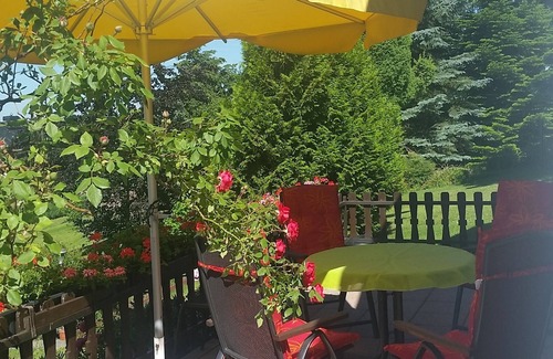 The house itself is not only idyllically embedded but also very lovingly furnished and equipped with every comfort. On the more than 18 m² terrace you can enjoy a wonderful view over Auerbach and the Göltzschtal from sunrise to sunset. You will rarely find more natural peace and family idyll.