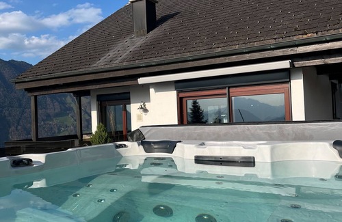 A large jacuzzi/whirlpool with counter-current system is a dream for swimming and bathing. Relax in the warm bath and enjoy the distant view of the lake and the impressive mountains in the panorama (Pilatus, Bürgenstock and the Rigi).