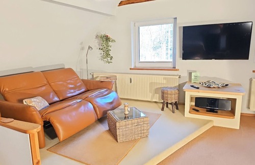 In the Thuringian Waldbaude are four highly individual apartments with very different character, no apartment is the other. Warm colors and natural materials provide the entire house for a friendly atmosphere. In the house you will also find a sauna and a fireplace room. The property of the Thuringian Waldbaude has a large private parking, a forest garden with pergola and views of the sunset, a forest terrace with barbecue and a large sunbathing area with sun loungers.