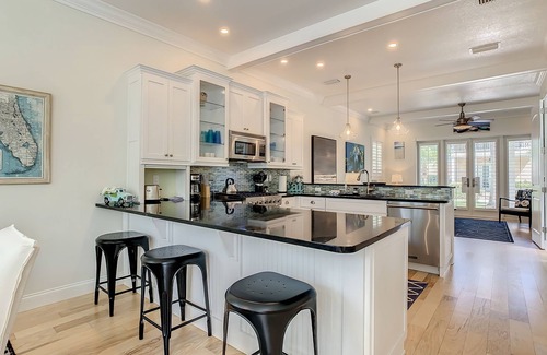 As you walk into this magnificent townhome you will feel right at home. Wood floors throughout, Florida-style decor and comfortable furnishings make this home one of the best in the community. The living room features a cozy section sofa, a 38" smart TV, and french doors leading to the patio where one can enjoy the Florida sun. The large, fully equipped kitchen features stainless steel appliances, a drip coffee maker, a kettle, and all your cooking essentials, The dining area offers seating for 4 with additional seating for 3 at the kitchen counter. A half bath and large pantry are also located on the main level.