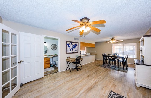 This home is fully stocked and furnished to accommodate up to seven guests. Features include one master bedroom and two guest bedrooms, one bath with shower and second bathroom with shower and tub. All bedrooms have closets. Private patio with hot tub, private yard and pool (not heated), corner lot, back yard with mountain views. Two living spaces and a dining area off the home's centered kitchen. Amenities include: Internet WiFi and each smart TV in the home is available for entertainment needs, located in main living room, king and queen bedrooms; Washer and Dryer in the home; BBQ outside with propane; swimming towels; essentials in bathrooms and kitchen; beverages included. Absolutely no events are allowed at this property. Long term stays are welcome, as well as short term travelers. Dogs only. No cats.