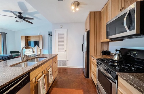 Walk through the small courtyard to the entrance and straight into the living room space where you'll find the TV and a dining area to your right, under a beautiful skylight. Feel at home with a fully stocked kitchen, perfect for a long or medium stay. The home's open concept allows for great entertaining with an island that seats four and a futon perfect for movie nights or watching the big game!