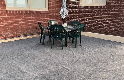 • There is a covered front porch with a large patio in the back that has a gas grill, propane firepit, and furniture.