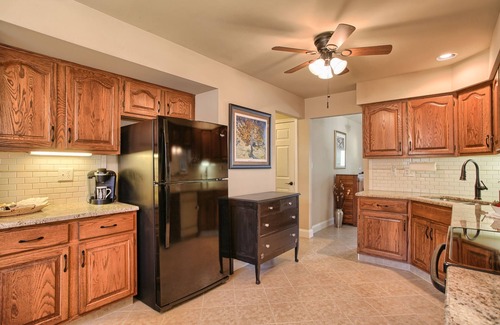 This one level, furnished home features a great room with cathedral ceiling, dining room next to the living room with a pass through to the eat-in-kitchen with granite counters and tile backsplash, pantry, sun room and large patio.