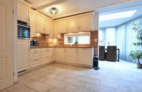 Ground floor: (hall(toilet), Living room(TV, seating area), open kitchen(hob(induction), electric kettle, hood, coffee machine(filter), oven(electric), microwave, dishwasher, fridge-freezer), conservatory(dining table(6 persons)))