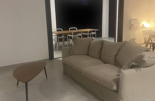 The bright and airy living room invites cozy moments with family and friends. The lounge is equipped with a flat-screen TV and comfortable seating, making it the perfect place to unwind after a day of activities. The dining area is ideal for shared meals where you can enjoy each other’s company in a pleasant environment.