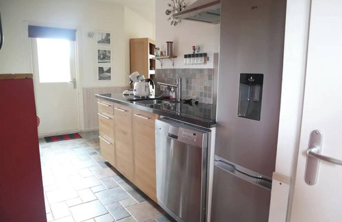 The living spaces are bright and welcoming, featuring a fully equipped kitchen, a comfortable sitting area with a fireplace, and a desk ideal for working. The dining area offers a pleasant view of the garden, while board games are available for family evenings. These convivial spaces are designed to accommodate your entire group in comfort.