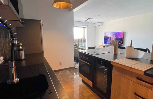 The apartment boasts a bright and inviting living area with a comfortable sofa section and a desk for those needing to work. The fully equipped kitchen allows guests to prepare delicious meals, while the dining area invites cozy gatherings.