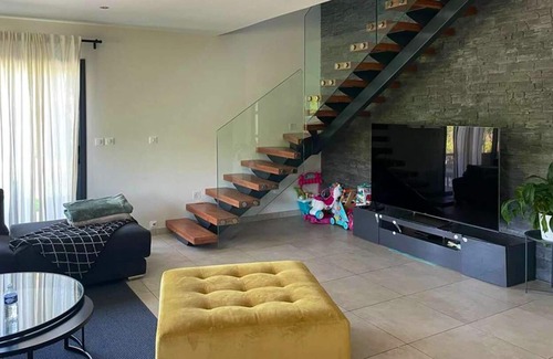 The kitchen is well-equipped for cooking up your favorite meals. Enjoy your feast around the dining table which seats 7 or outside, in the garden or on the terrace enjoying views of the swimming pool.