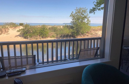 Beautiful water views from this one bedroom condo located on Lake Michigan inside the Homestead Resort property on M-22 in Glen Arbor, MI (Sleeps 4 - Queen Bed in the bedroom and a Brand New sleeper sofa "gel-pedic queen mattress" in the living room). Very private location, lake and river views, gated parking by the beach, and beautiful sunsets over the lake.