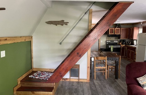 Musky Hideaway Cabin is a spacious 2-bedroom A-Frame sitting on a hill with trees on multiple sides of the property. It has recently been remodeled with unique fishing decor. There are two balconies - 1 is private from a bedroom and one is off the main room and attached to the porch leading to main grass area. Additionally, off the back of the cabin is a covered deck/patio with a private area for hot tub use and a fire ring area on gravel with wood log seating area. Check-in time is 5pm is and Checkout time is 12pm (noon). Unfortunately, the parking area can NOT accommodate a boat and trailer at this time.