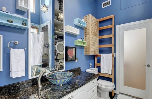 The bathroom is really the best you will ever see. It has a very rare labradorite countertop, hot water on demand, a 1902 claw foot tub with huge windows and a skylight overhead, and a full-size washer and drier.