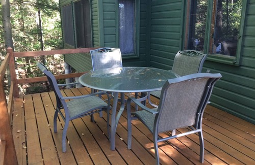 Beautiful, private, comfortable, spacious, studio cabin in wooded area steps from lake. Originally a writer's studio, this cottage is part of a two-cottage compound. Cabin is self contained with large deck and has all the comforts of home: well equipped kitchenette with microwave, stove, fridge, freezer, heat pump for heat and AC, bathroom with shower, queen bed, high speed Internet. Everything provided including linens/blankets, canoe, kayaks, rowboat, life jackets, huge shared dock, fire pit. Lake views. Steps from lake. Three night minimum stay at $130 per night plus 12% Vermont Room Tax..