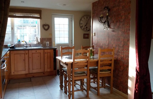 Step into the cosy lounge with old wooden beams overhead and your eye will be drawn at once to the huge stone fireplace (found during renovation work) which surrounds the log burner, a must for those cold nights in winter (plenty of logs at the back door) while cosying up to toast marshmallows! Adjacent to the beautifully appointed lounge with muted Farrow and Ball tones, is the dining kitchen with ample room for 4 people to dine under the twinkling lights of the chandelier. The kitchen is well equipped with every modern convenience - washer dryer, dishwasher, microwave, electric hob and oven - literally a home from home.