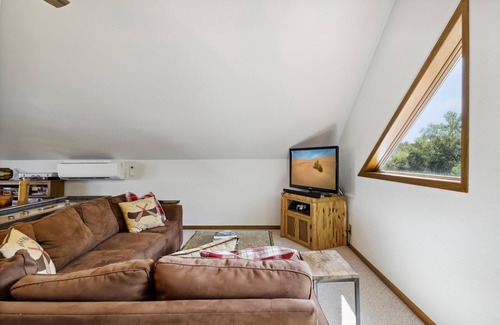 The loft also has another entertaining area with a large sectional with a pull-out queen bed, 40" tv, Playstation, Xbox, video games, movies, and a large variety of board games. There is even a custom log poker table with log chairs and a shuffleboard table for your enjoyment!