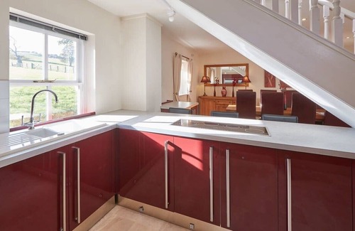 The Stable has a spacious open plan kitchen diner. Modern in style, the kitchen has high shine, oxblood cabinets with integrated appliances. Fully equipped for self-catering stays, you’ll have full use of the oven, hob, coffee maker, microwave, kettle, toaster, fridge, dishwasher, washing machine and dryer. The dining area has a wooden dining table and matching oxblood, leather chairs.