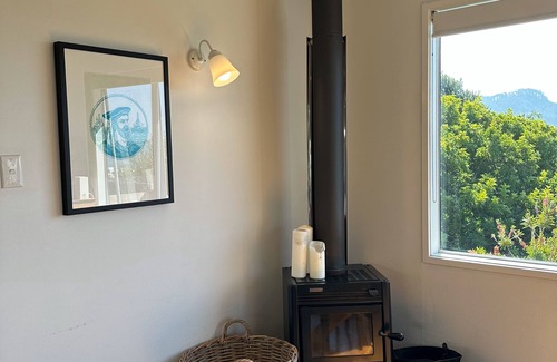 The open-plan living is spacious and bright. There is a fireplace, for those colder months which makes Black Bach perfect for stays at any time of the year. The kitchen although small has everything you need for your stay, including a Nespresso machine, so feel free to bring your favourite pod flavours and enjoy your morning coffee in the comfortable lounge with couches, and a flat-screen Smart TV, or at the dining table which has seating for four. Of course, you could always head through the ranch slider outside onto the deck, where you will have stunning views of the water. With an outdoor table and chairs and a BBQ, enjoy your meals al fresco while looking out over the bay.