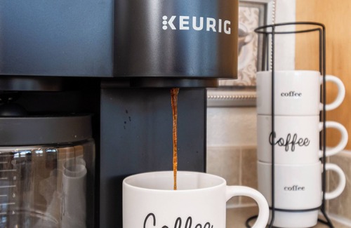 ✦ Coffee pot, Keurig, and kettle stocked with coffee, pods, and tea