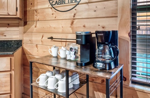 Living room includes a love seat and a sofa that converts to a pull-out bed that sleeps 2. The 50-inch flat screen TV is above the gas fireplace. Like the rest of the TVs in the cabin, it’s a smart set, so bring your passwords to your accounts for easy access to the apps you enjoy.