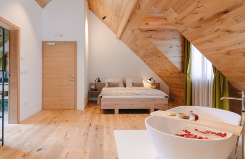 The luxurious suite with balcony is the second-largest unit located on the upper floor and offers a pleasant stay for couples as it has a large double premium bed with to order linen for a good night's rest. A bath tub is placed near the sleeping area, which is ideal for relaxed or romantic moments. The space continues into the living room area, where guests can enjoy a cup of coffee or tea in the dining area or lounge on the sofa in the seating area adjacent. Let's not forget about the balcony which offers a pleasant nature and rural view with the full wall made of glass letting plenty of natural light into the suite for a pleasant and cosy ambient. An ensuite private bathroom connects the living and sleeping areas and offers an additional shower as well as toilet, bidet and sink with mirror. Guests are guaranteed to have a pleasant and relaxed stay!