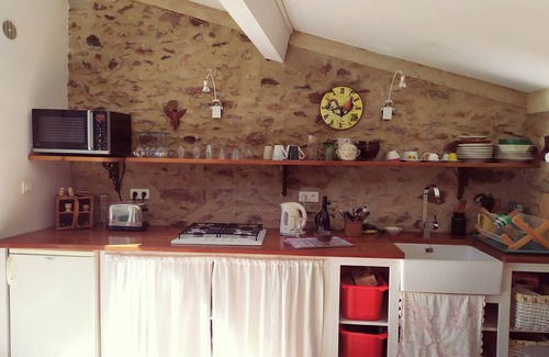 House 5 is an old shed restored in 2008 and located at the end of a cobbled cul-de-sac. Peace and privacy guaranteed! Maison 5 is in its layout an elegant combination of contemporary and old with its stone and lime walls, its polished concrete floor and its parquet floor, its modern bathroom, its rustic bedroom, its bright kitchen and its sunny terrace. with Italian cobblestones. The kitchen is carefully equipped, all the furniture and decoration are a mixture of flea market furniture and objects brought back from distant travels. Character, charm and comfort!