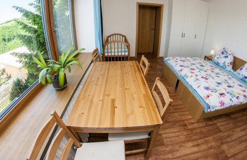The first floor for 6-16 persons: 7-bed room with balcony, 6-bed-room with balcony, 4-bed-room without balcony, kitchen with enough seats. The 2nd floor 6-11 persons: 4-bed room with balcony, 4-bed room with balcony, 3-bed room without balcony. • The kitchens are modern equipped: induction cooker, oven, dishes, refrigerator, freezer, dishwasher, microwave, cooker, ventilator, coffee machine. • All rooms are equipped with LED TV, with USB and Internet TV. Wifi is very fast and funkzioniert perfect everywhere in the house. • All the rooms have a beautiful view - over the town Vrchlabi, on the slope (Knezicky Vrch) or the rear rooms to the forest and meadow. • Each bathroom has been reconstructed, the shower cubicles are really great • Children's equipment - baby beds, toys, children's chairs WC reduction etc. A children's room under the stairs. In the summer a swimming pool and a trampoline. A drying room for shoes on the ground floor, bicycles, motorcycles and ski storage in the garage. Parking outside the house for free. A living room with FIREPLACE and PIANO and TV on the ground floor, wood free. We know everything about the local restaurants, food delivery service, skiing facilities and ski schools for children and sports.
