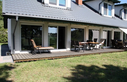 The modern apartment is located in a two-family house, which was only finished in 2009 and until now has only been used by the owner for vacation purposes. The special location is that the house is located in the beautiful, old town of Brodnica, as well as directly on the lake shore of Lake Niskie Brodno (with its own jetty). In the city center (approx. 2 km away) there are historical sights (e.g. Viewing tower and ruins of a crusader castle), as well as numerous shops, bars, cafes, restaurants, etc. On the public 'city beach' about 400 m away, numerous leisure activities are offered (kayak, scooter rental, tennis court, volleyball court, etc.) The maisonette is divided on the ground and first floor: below: living / dining room (TV with satellite system) and bathroom; Above: Living room / bedroom with a second separate bedroom. Both below and above you have a beautiful view of the lake and below also a large, sunny terrace.