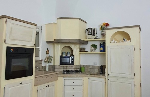 Holiday home in Salento, a few meters from the sea. Completely renovated. Typical house in stone, with vaulted ceilings, two equipped kitchens with two ovens, one of which microwave, double bathroom, two double bedrooms, panoramic sea view terrace, perfect for alfresco dining. Possibility of an additional bed in the small bedroom. Equipped with every comfort with washing machine, dishwasher, vacuum cleaner, robot Thermomix and air conditioning. Flat screen television in the living / dining area. Available baby bed and stroller.
