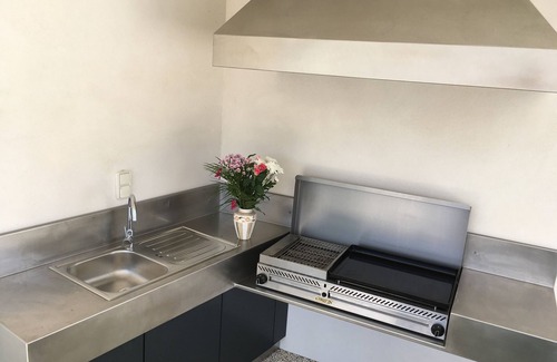 Summer kitchen with plancha + grill, garden furniture, sunbeds.