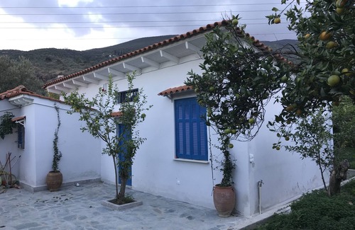 The single floor 75 sqmt house with ceramic tile roof is in a 1,300 sqmt private lemon grove with few ancient olive trees, in the ancient site of the Artemis (Diana) temple. It has a living room, a large kitchen/dining room and 2 bedrooms with 1 bath and an additional outdoors shower. There are 5 beds plus one more in the living room. There is outdoor space in the front and the two sides of the house.